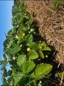 Nachdem wir die Pflanzen über Nacht noch einmal mit Vlies geschützt haben, ist ab morgen keine Frostgefahr mehr gemeldet. Die ersten Reihen haben wir bereits mit Stroh eingestreut – so bleiben die Erdbeeren später schön sauber und trocken. Die Maschine verteilt das Stroh zwischen den Reihen, aber unter die Pflanzen bringen wir es per Hand.