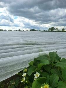 Kalte Nächte stehen an – und da Erdbeerblüten schon bei –0,5 °C Schaden nehmen, decken wir aktuell täglich unsere gesamte Fläche mit schützendem Vlies ab. Ganz schön viel Arbeit, aber unbedingt nötig für eine gute Ernte.