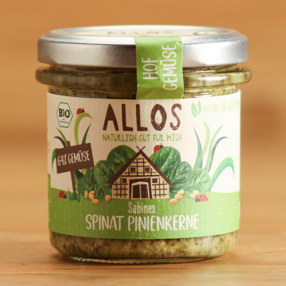 weniger anzeigenSteffis Spinat Pinienkerne Hof-Gemüse Brotaufstrich von Allos ist ein leckeres Geschmackserlebnis fürs Brot. Die köstliche Kombination von Spinat und Pinienkernen macht Ihre Brote zu köstlichen Snacks mit vollem Gemüsegeschmack - kein Wunder bei 64 % Gemüseanteil!