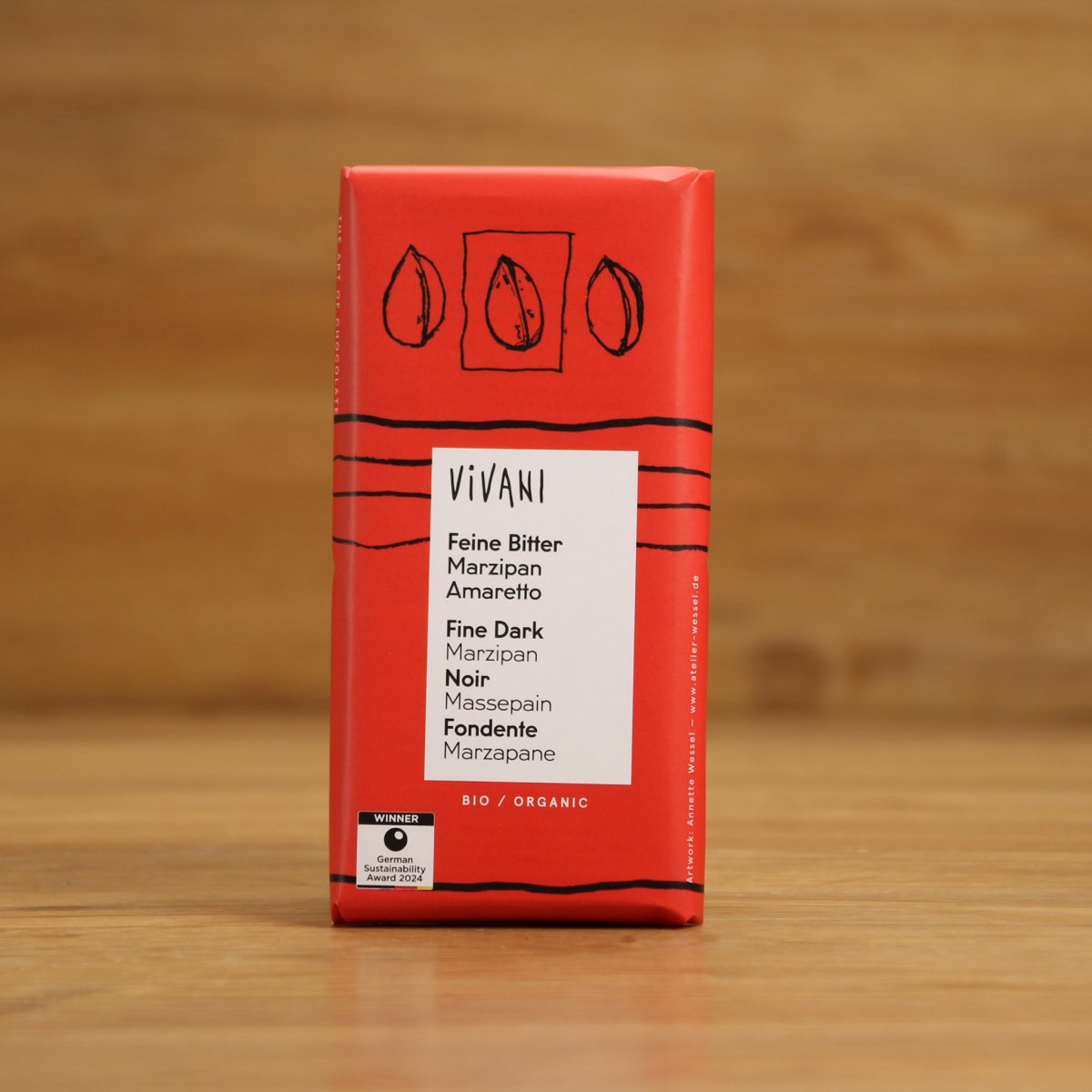 Zutaten: Roh-Rohrzucker*, Kakaomasse*, Honig-Marzipan* 15% (MANDELN*, Honig* 45%), Glucose-Sirup*, 2,5% Amaretto* (60% vol), BUTTERreinfett*, Kakaobutter*. Kakao: 60 % mindestens.