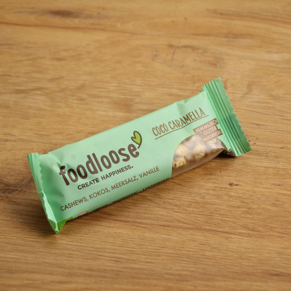 weniger anzeigenDer Coco Caramella Riegel von foodloose schmeckt wie Urlaub in der Karibik mit sonnigen Sandstränden und einer erfrischenden Brise in der Luft. Er besteht aus Sonnenblumenkernen, knackigen Cashewkernen, Kokoschips, Kardamom, Vanille und etwas Meersalz. Diese Zutaten werden mit Agavendicksaft und Kokosblütenzucker vermischt, flach ausgerollt und nach dem Aushärten in Riegelform geschnitten. Alle Rohstoffe werden sorgfältig ausgewählt und sind zu 100% bio. foodloose Nussriegel bestehen grundsätzlich immer nur aus knackigen Nüssen, Saaten, süßen Trockenfrüchten und spannenden Gewürzen. Alle Riegel sind vegan, laktosefrei und glutenfrei. foodloose Bio-Riegel sind nicht mit herkömmlichen Müsliriegeln zu vergleichen: auf Aromen, jegliche Art von Zusatzstoffen und Füllstoffe wird verzichtet. Für die beiden Gründerinnen Katharina und Verena steht die Qualität an erster Stelle. Alle Rezepturen sind inspiriert von schönen Reiseerlebnissen oder Erinnerungen des foodloose-Teams.