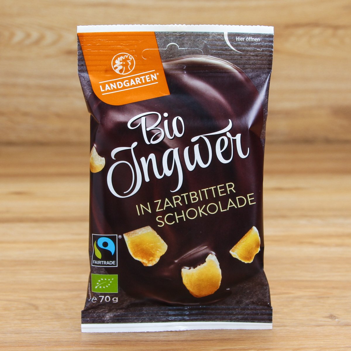 Zartbitterschokolade* 55% (Kakaomasse*, Rohrzucker*, Kakaobutter*, Kakaopulver stark entölt*, Emulgator: SOJALECITHIN*), kandierter Ingwer* 43% (Ingwer* 55%, Zucker*), Überzugsmittel: Gummi arabicum*; Zucker*, Dextrose*. Kakao: 62% mindestens in der Zartbitterschokolade. Kakao, Rohrzucker: nach Fairtrade-Standards gehandelt (mit Mengenausgleich), www.info-fairtrade.net. Gesamtanteil: 54 %