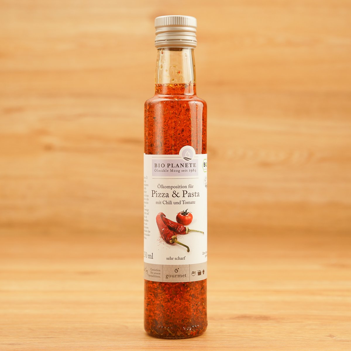 Die Ölkomposition mit Chili und Tomate verleiht Ihren Gerichten eine scharfe und aromatische nach Knoblauch, Olivenöl und Kräutern Note.