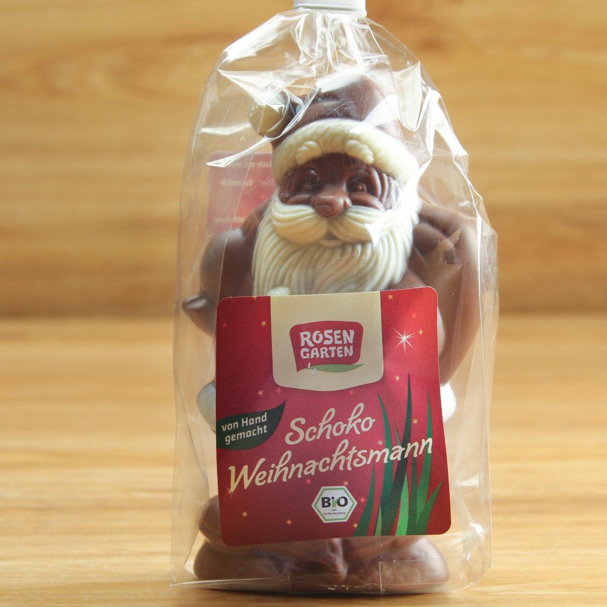 Weihnachtsmann aus bester Bio-Vollmilchschokolade, leicht mit weißer Schokolade geschminkt - in kindgerechter Optik