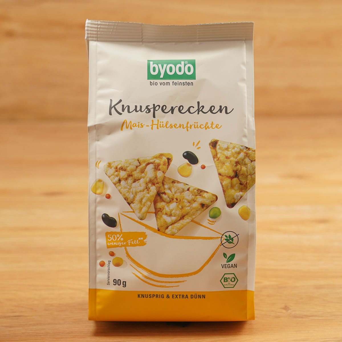 weniger anzeigenDie veganen und glutenfreien Byodo Knusperecken Mais-Hülsenfrüchte werden ohne Frittieren gepufft und anschließend lediglich mit etwas Salz und wertvollem Maiskeimöl besprüht. Sie schmecken pur als Snack ebenso köstlich wie in der Kombination mit Dips und Saucen wie z.B. Sour Cream.