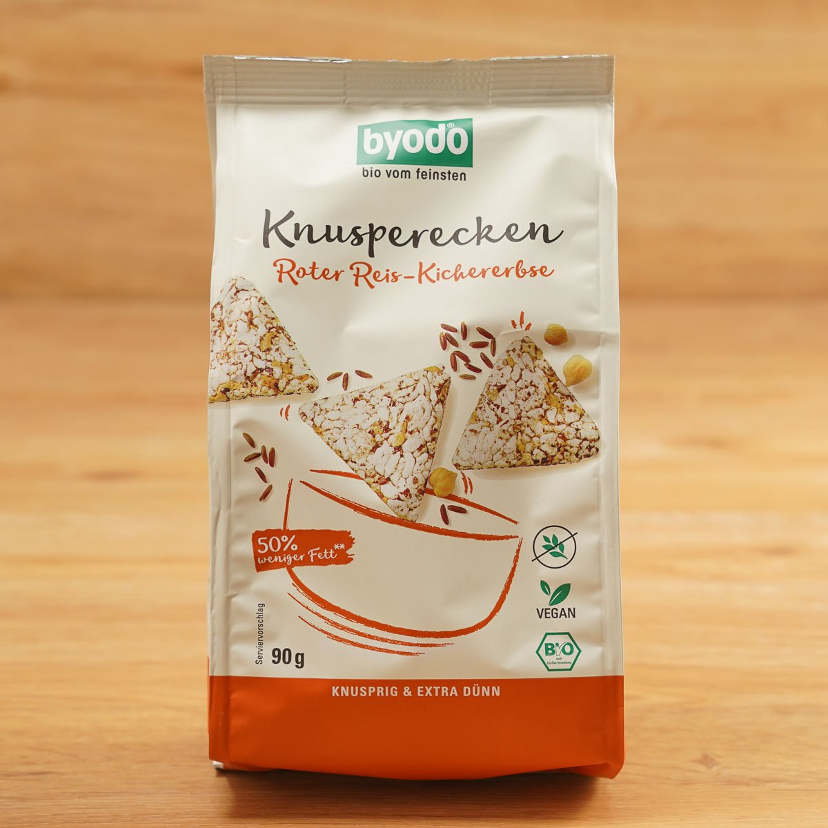 Die wunderbar leichten Byodo Knusperecken Roter Reis-Kichererbse bilden mit 50 % weniger Fett die optimale Alternative zu klassischen Chips. Die schonende Verarbeitung des biologischen Vollkornreises und der feinen Kichererbsen aus Italien sorgt für eine leicht nussige Note und garantiert eine Vielzahl an köstlichen Verwendungsmöglichkeiten der Knusperecken. Für ein klassisches, orientalisches Genuss-Erlebnis kombinieren Sie die knusprigen Ecken mit der cremig-fruchtigen Byodo Curry-Mango Sauce. Oder genießen Sie die Ecken mit einem selbst zubereiteten Hummus. Auch als purer, herzhafter Snack für unterwegs sind die glutenfreien Knabberecken dank ihres leckeren Geschmacks wunderbar geeignet. Sie sind übrigens gluten- und hefefrei und werden ohne Zuckerzusatz hergestellt.