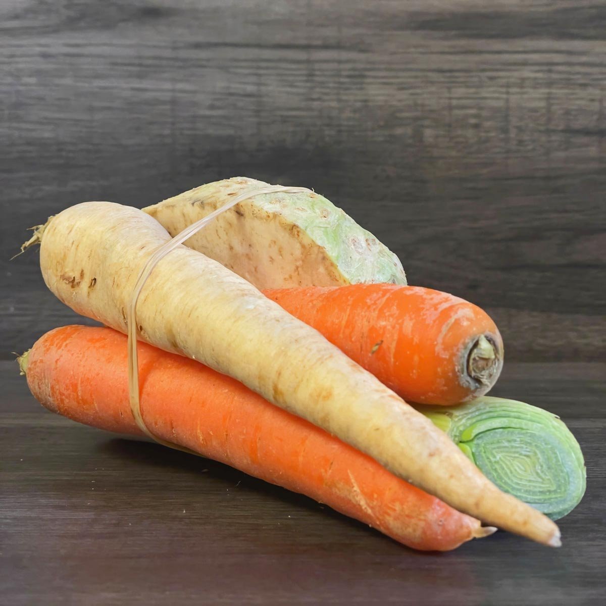 Ein Bund beinhaltet: Möhre, Porree, und Pastinake