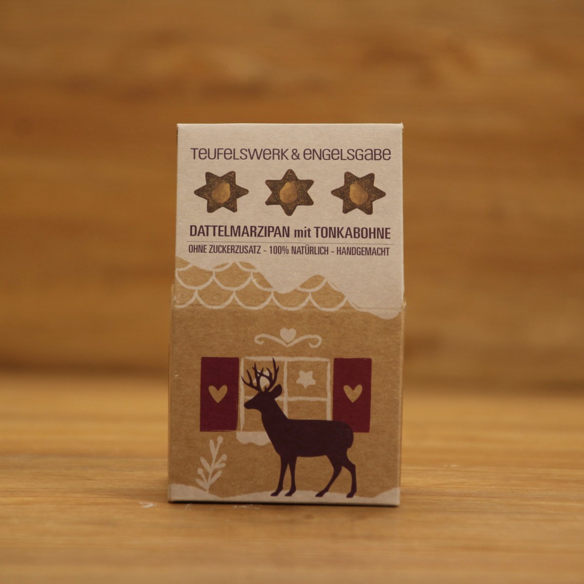 Zu Weihnachten darf Dattelmarzipan in keinem Nikolausschuh und auf keinem Weihnachtsteller fehlen! Unser Dattelmarzipan mit Tonka verbindet die natürliche Süße von Datteln mit dem unvergleichlichen Geschmack der Tonkabohne. Dieses Weihnachtskonfekt wird aus feinsten, entsteinten Datteln und hochwertigen Mandeln hergestellt, die zu einer cremigen Marzipanmasse verarbeitet werden. Die knackige Mandel in der Mitte des Sterns geben dem Dattelmarzipan den letzten Schliff.