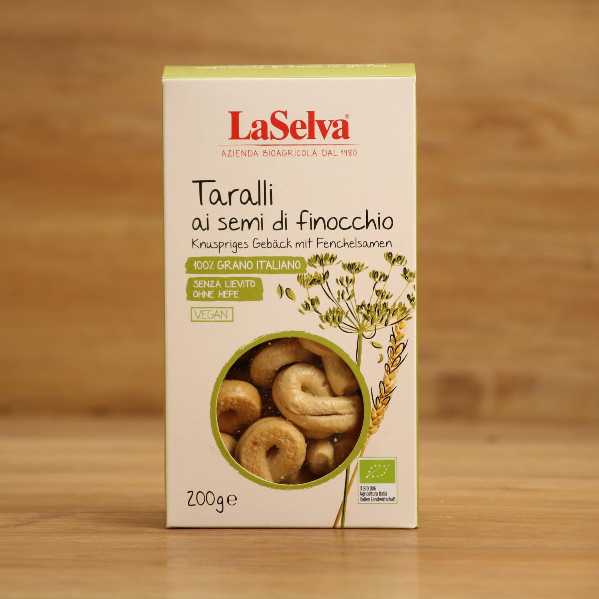 Diese knusprigen Kringel werden nach einem traditionellen Rezept in Apulien gebacken. Die Taralli sind verfeinert mit Fenchelsamen und nativem Olivenöl extra.