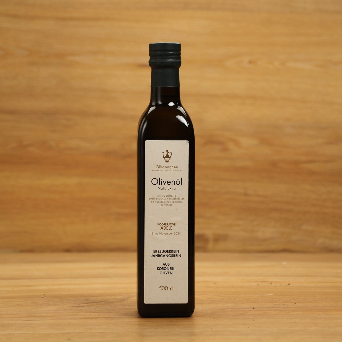 Mittelfruchtiges, leicht herbes Bio Koroneiki Olivenöl erster Güteklasse von der Kooperative aus Adele auf Kreta. Die Kooperative des Dorfes Adele im Distrikt Rethymno ist eine private Initiative von Kleinbauern im Ort.Stelios Kaliouris, Sprachrohr und Vorstand der Kooperative, hat im griechischen Olivenölpanel verkostet und organisiert für uns die Abfüllung der besten Qualitäten aus der Region. Die Ölmühle läuft mit modernen, sehr schonend arbeitenden Maschinen. Besonders schonend werden hier die Bio Oliven der Sorte Koroneiki