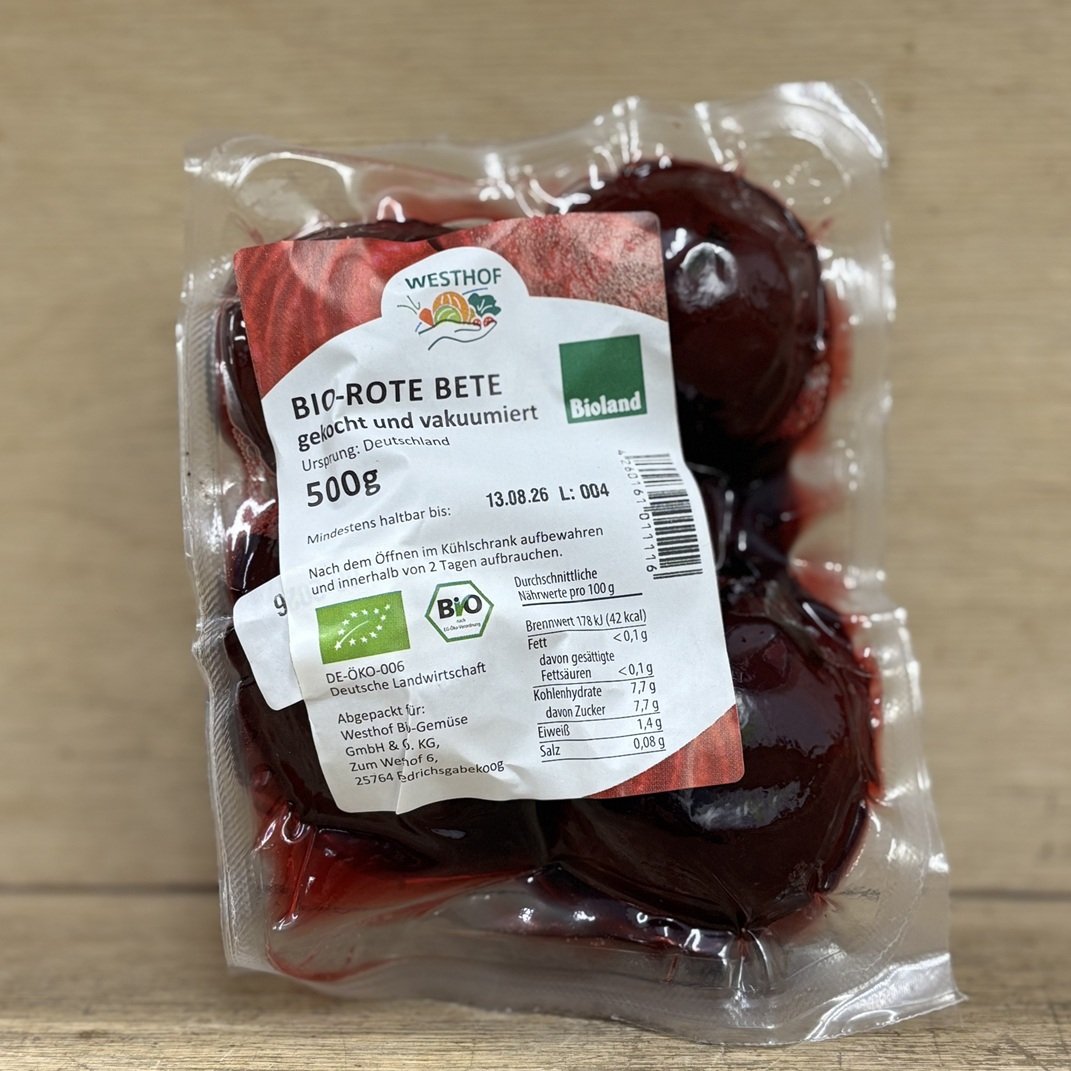 Für alle Liebhaber von Roter Bete, die das Schälen vermeiden und auf die Säure der eingelegten Knolle verzichten möchten. Frisch vom Feld geerntet, geschält, gekocht und einvakuumiert, sind sie schnell zubereitet. Ideal für Rote-Bete-Carpaccio, Eintöpfe, Chutneys und Salate.